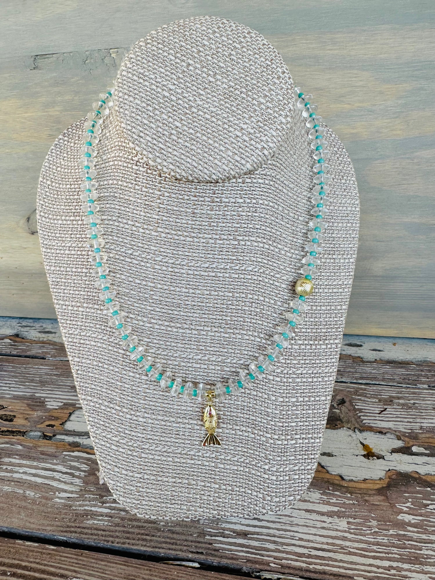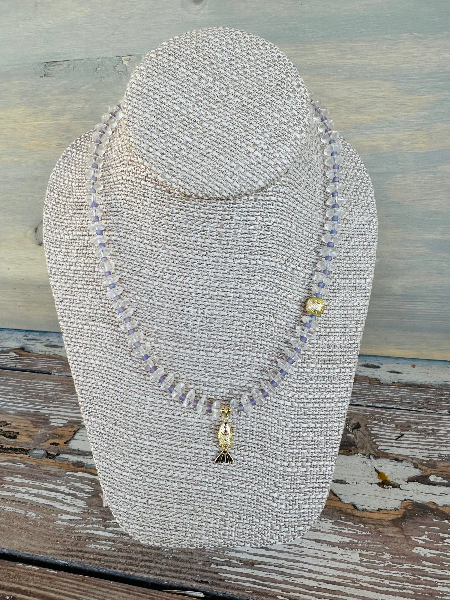 She’s graceful with clear quartz rondelle beads with peeps of color between each using glass seed beads-surprise yourself with our clear choice for romantic escapades.