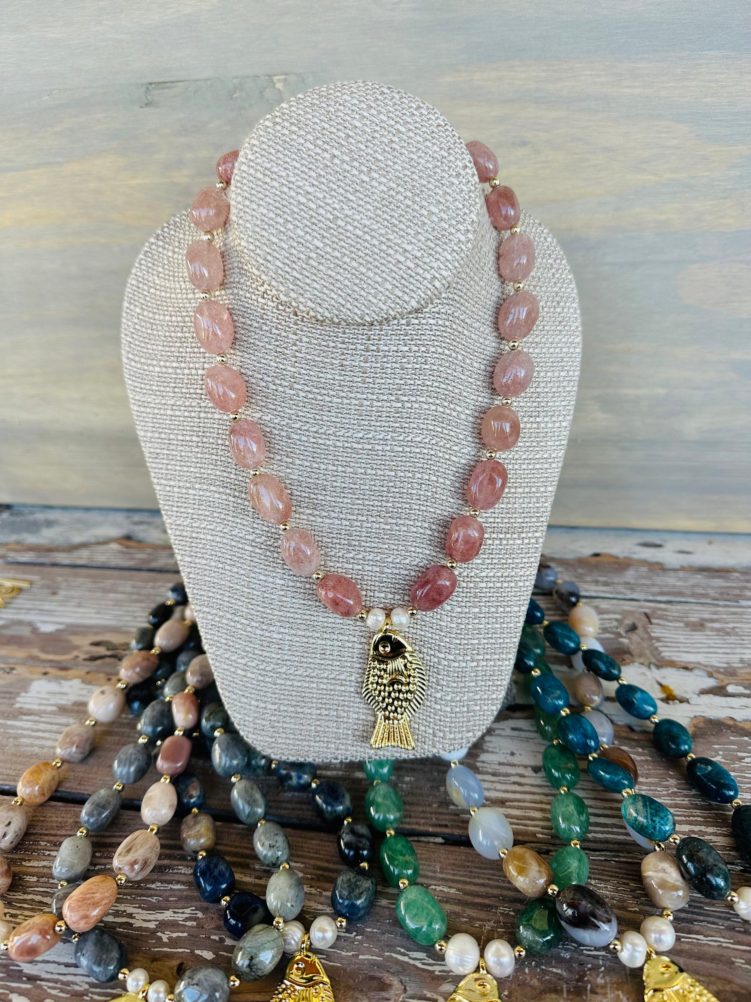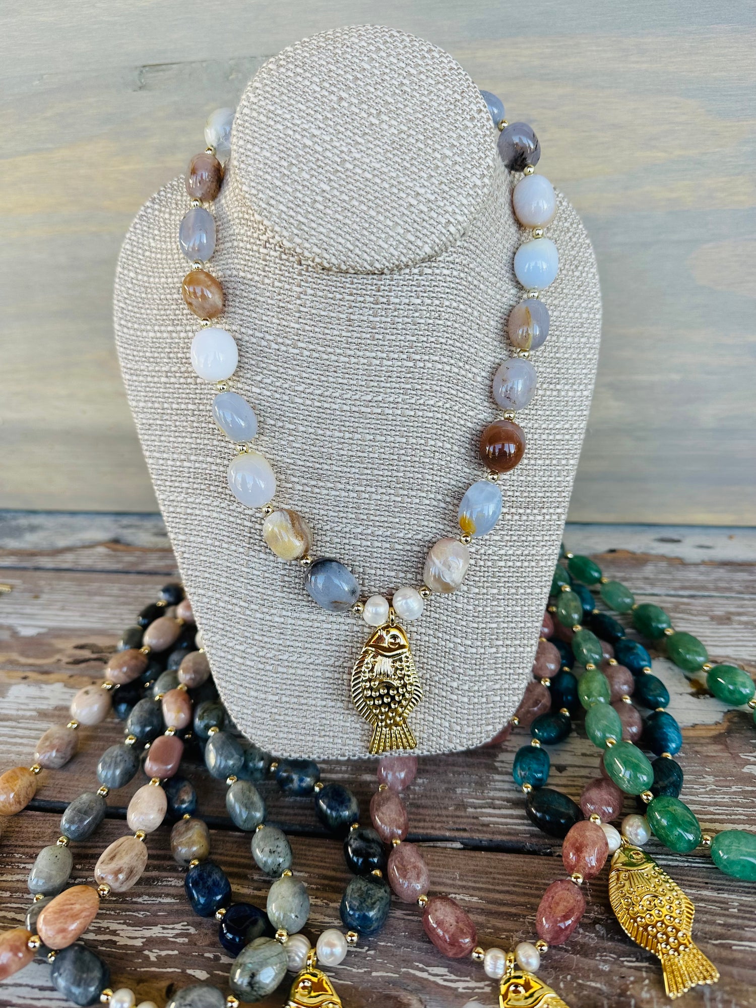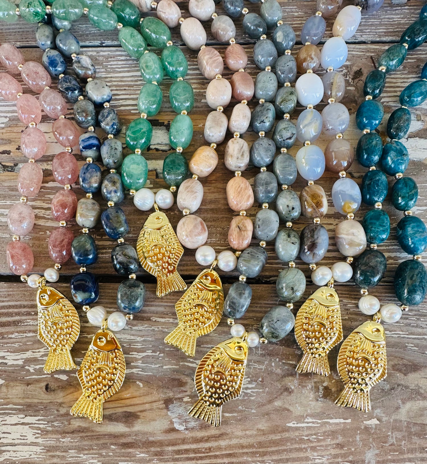 Shiny & smooth gemstone nuggets spaced with 14k gold beads & a gold 3D girly textured fish pendant anchored with 2 jumbo freshwater pearls for showing off the tropical girl you are!