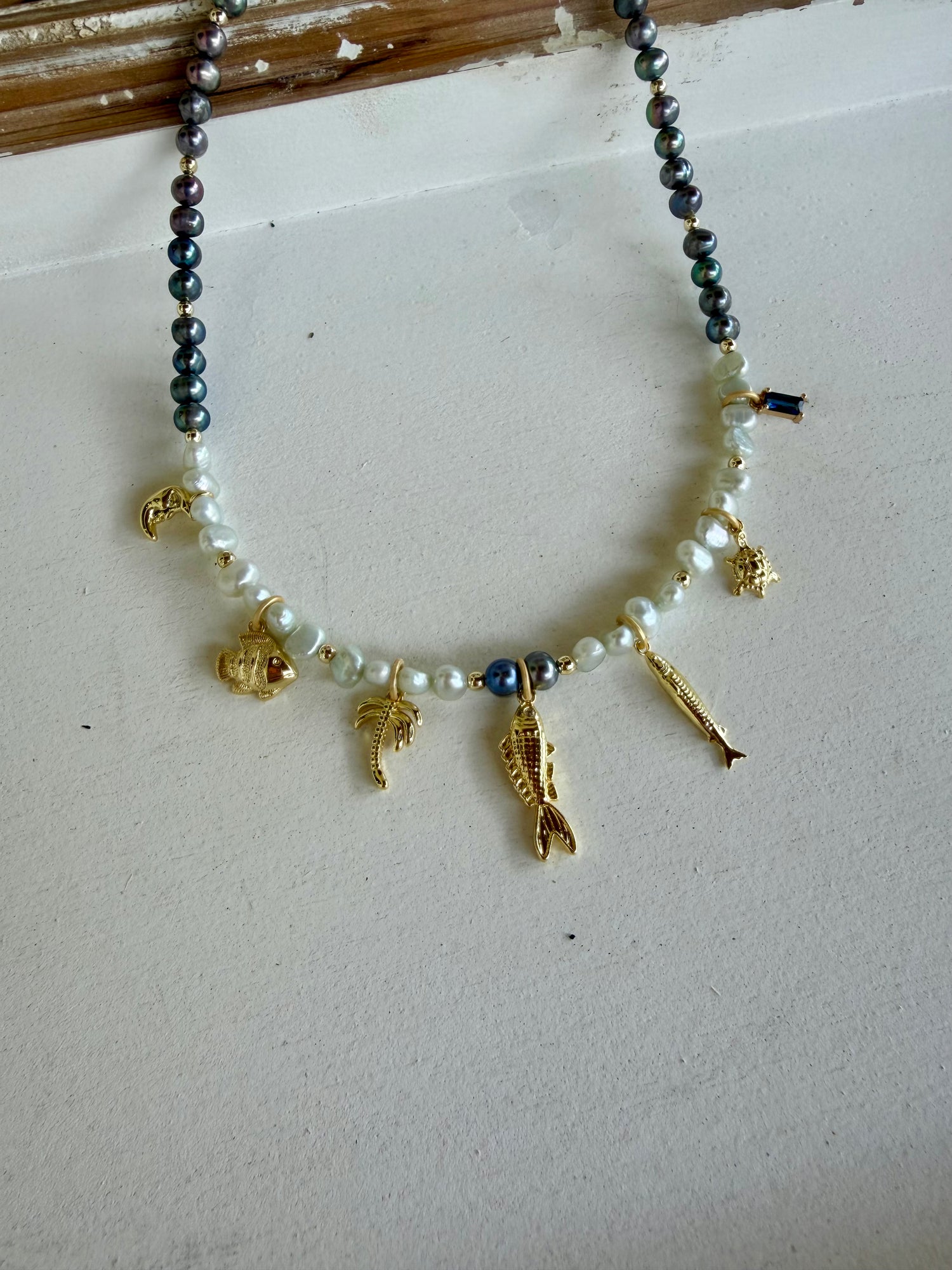 Abalone (peacock colored) freshwater pearls & light gray freshwater pearls are the base for this cutsey, high-quality necklace dangling with all PVD gold baby charms.