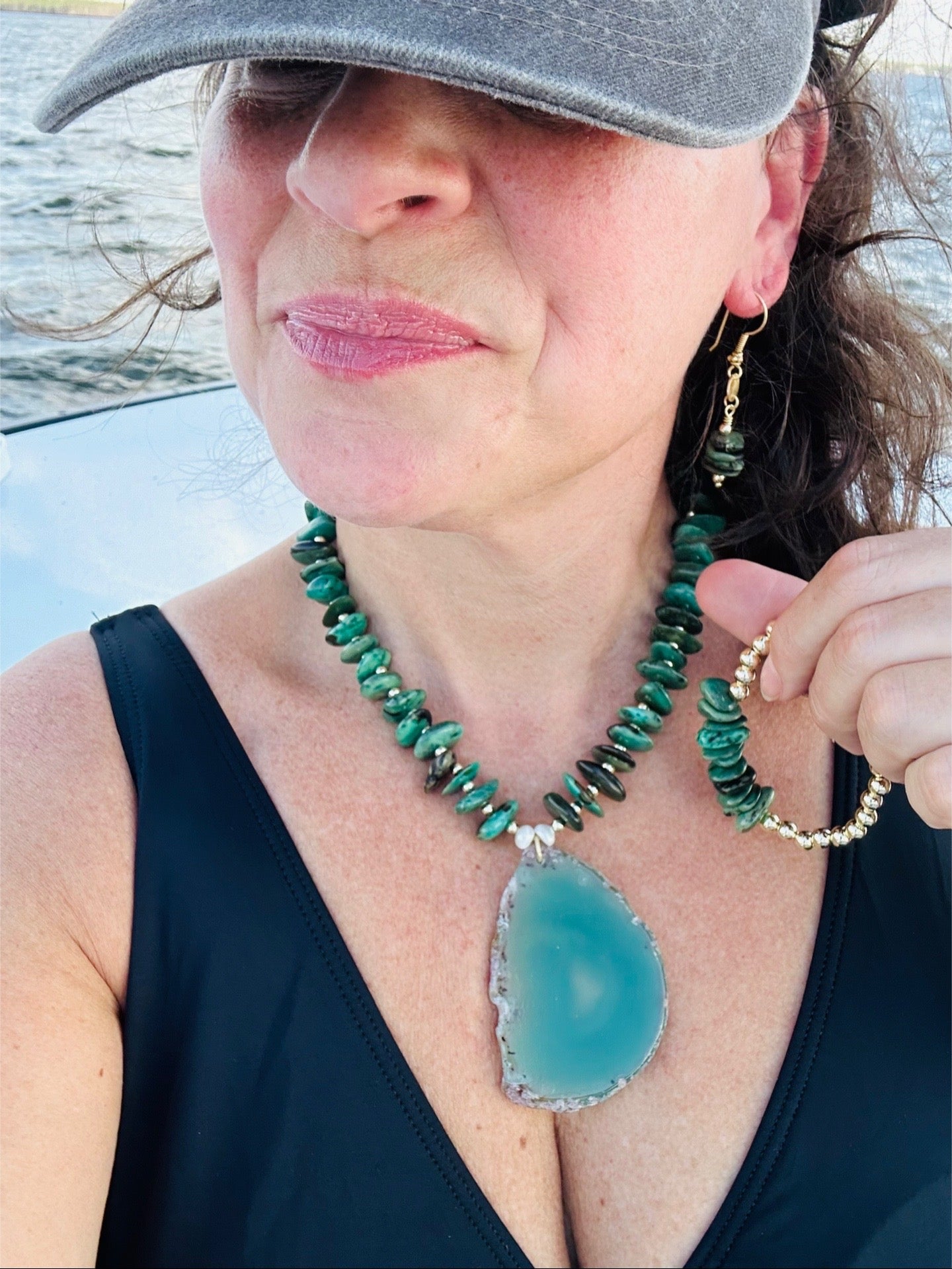 The Green Goddess bundle includes this handcrafted necklace with one of a kind agate estate pendant, matching earrings & bracelet.