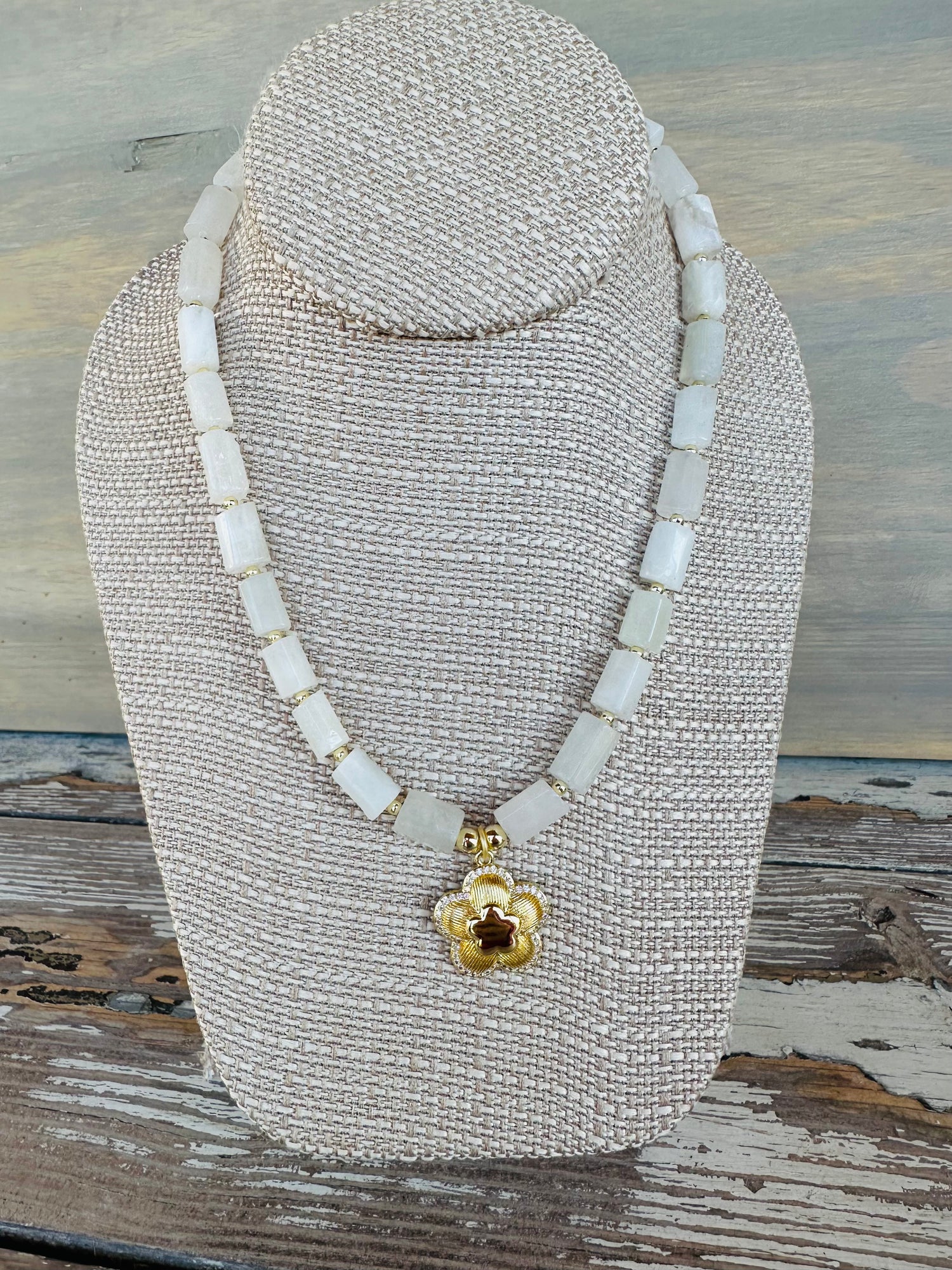 The sweetest barrel shaped gemstones in 2 color option surround our 3-D flower pendant with tiny rhinestone perimeter accents.